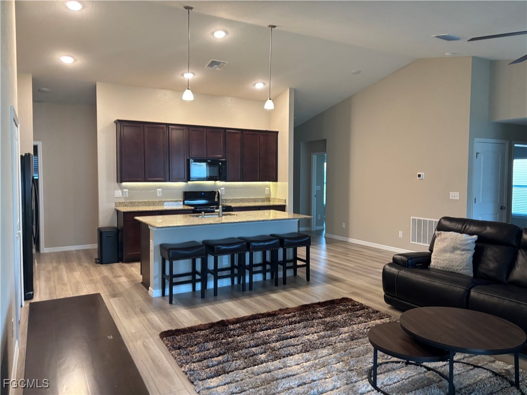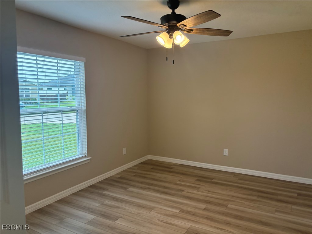 Here is your chance to rent an upgraded 4-bedroom home in the SW-Cape at an affordable price. Built in 2021, this Holiday Builders Delray Elevation A was totally upgraded by the builder when constructed. This home features Luxury PVC vinyl flooring throughout the entire home for easy cleaning and maintenance. Granite counter tops in the kitchen and baths, upgraded cabinets throughout the home and 42-inch upper cabinets in the kitchen. LED lighting package in the entire house and black appliances and the 4th bedroom / den option was added along with the rear covered lanai. As you enter the home you notice the wood look plank flooring throughout. There is a formal dining area or could be used as a den when you enter with the 3 guest bedrooms and bath off to the left. Further into the home the great room features cathedral ceilings with LED lighting and shares the kitchen area with a large island / breakfast bar for easy meals and entertaining. Upgraded wood cabinets with 42-inch upper cabinets in the entire kitchen and a large pantry. Part of the great room is designed as an additional dining area if desired. There are large windows and the slider in the great room out to the covered lanai. The entire great room area is designed for family gatherings with the openness to the kitchen, living and dining areas. To the right of the great room is a very large primary bedroom which easily fits king size furniture with room to spare. The main bathroom features dual sinks with granite counter tops, a step-in shower, separate toilet room and an extra-large walk-in closet with room for tons of clothes and storage. Each of the 3 guest bedrooms has a large closet with bifold doors. The second bathroom is centrally located convenient to the 3 bedrooms. As you enter the home from the 2-car garage there is an indoor laundry room located just off the kitchen area and garage entry is conveniently located to the kitchen area for ease of entry and grocery delivery. Conveniently located between Skyline and Chiquita Blvd just south of Gleason Pkwy. Close proximity to Veterans Pkwy, transportation stops, restaurants, shopping and medical centers. Located near Gulf Elementary & Middle Schools, Ida Baker & Oasis Charter Schools. Not in a flood zone.