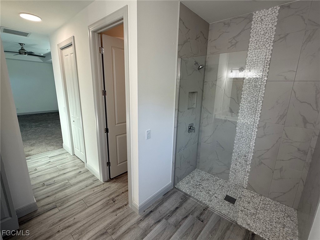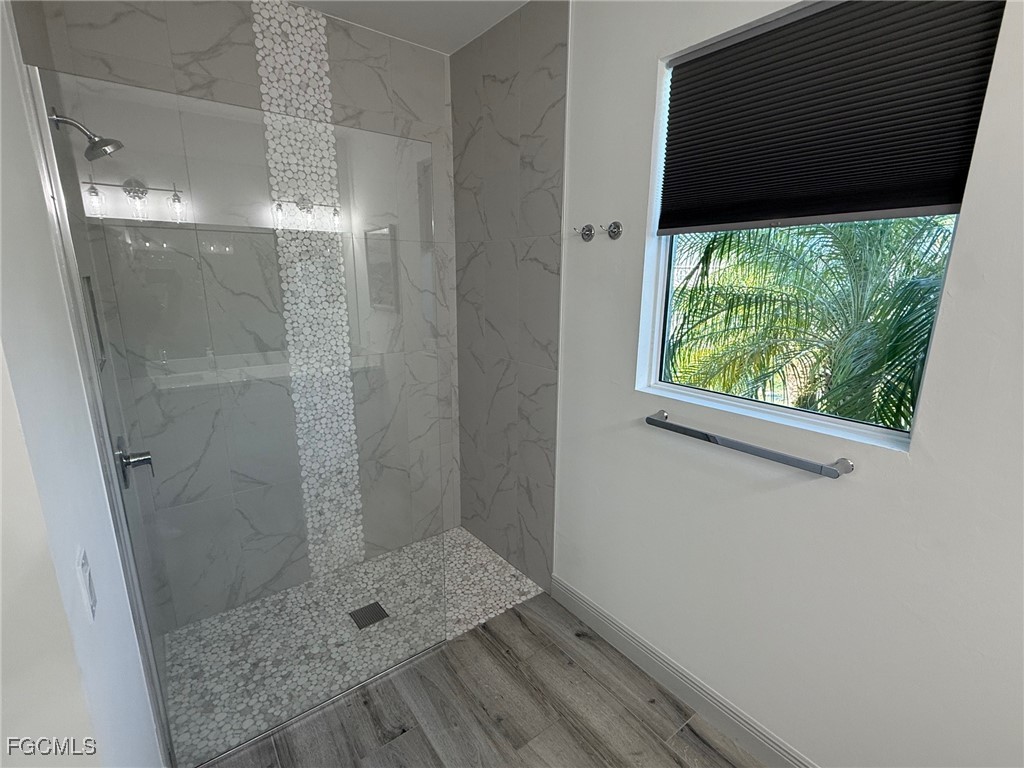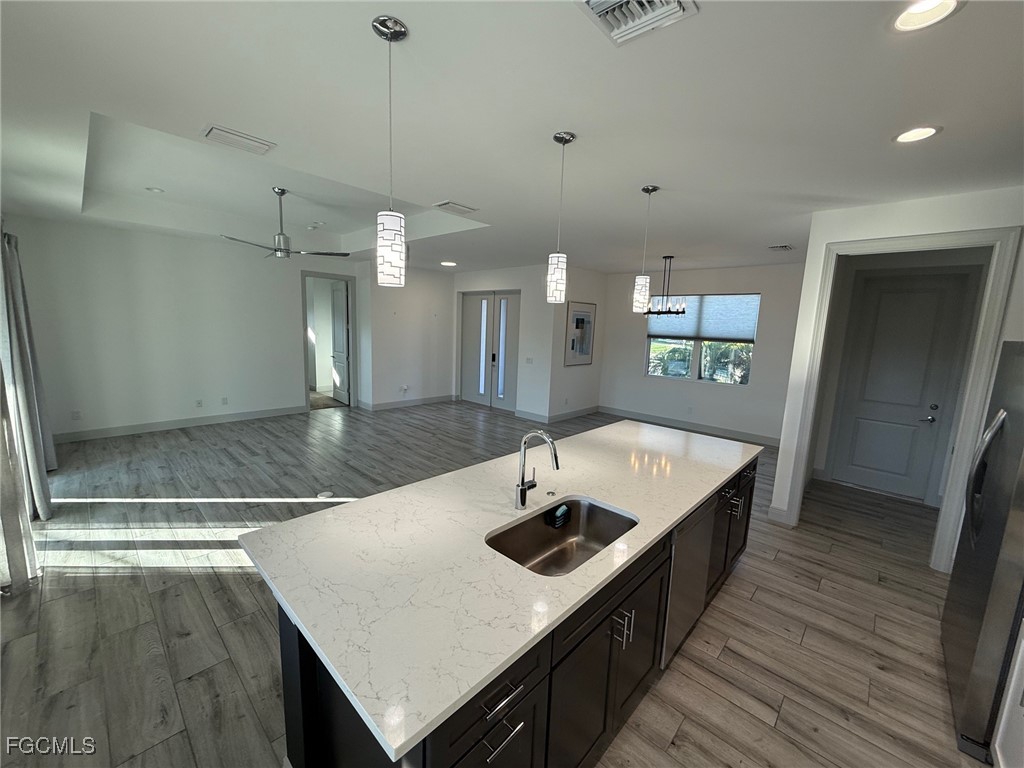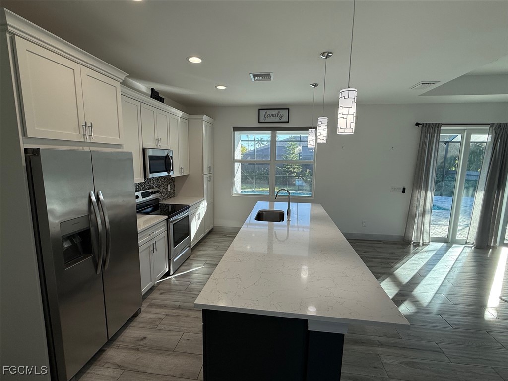 This 2022 three bedroom, two bathroom property features hurricane impact doors and windows. Tile in the main areas and carpet in the bedrooms. An open floorplan with ample space for entertainment. The kitchen features wooden cabinetry, a kitchen island, as well as all Stainless Steel Appliances. The primary bedroom is located on the right side of the house, it features his & her closets, dual sinks, a separate toilet and a modern walk in shower with glass shower wall. The two guest bedrooms are located on the opposite side of the house and they share a bathroom that is located between the two bedrooms. The guest bathroom features a tub/shower and a sink. There is ample space on the pavered lanai deck which also features a large pool cage. The swimming pool is electrically heated and can be used year round. The backyard is also fenced in which makes it very private.