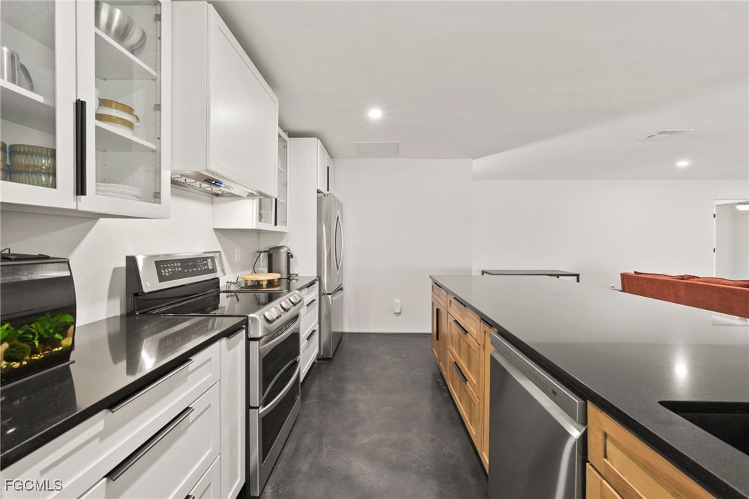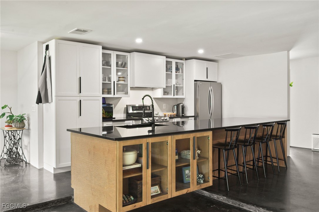Step inside and you’ll immediately notice the custom details throughout. The home is finished with concrete floors, Z-Trim baseboards, and durable Purple Board (moisture-resistant drywall alternative), ensuring both longevity and style. A complete custom kitchen serves as the heart of the home, featuring Kraftmaid cabinets, a 12’6” island with seating, custom range hood, and beautiful glass cabinet doors—perfect for entertaining and cooking in style.