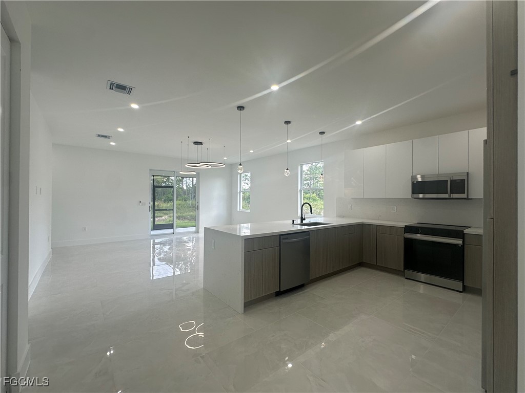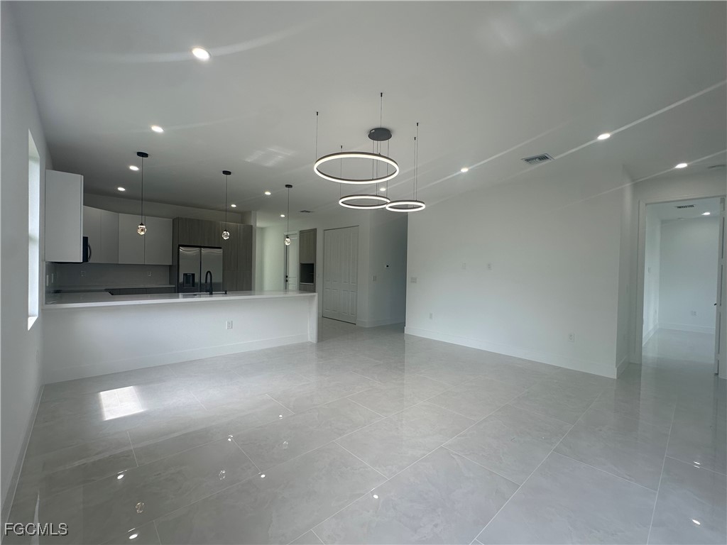 Step into this beautifully designed 4 bedroom, 3 bathroom, 2-car garage home, perfectly blending modern finishes with functional living.Bright open-concept layout with high ceilings and recessed lighting. Stunning porcelain tile floors throughout the entire home. Gourmet kitchen, quartz countertops, island seating, and modern pendant lighting. Stainless steel appliances and modern fixtures for a sophisticated touch. Spacious living and dining area with sliding glass doors leading to the backyard. Elegant bathrooms with floor-to-ceiling tile showers, frameless glass doors, and floating vanities. Laundry closet with hookups conveniently located inside.