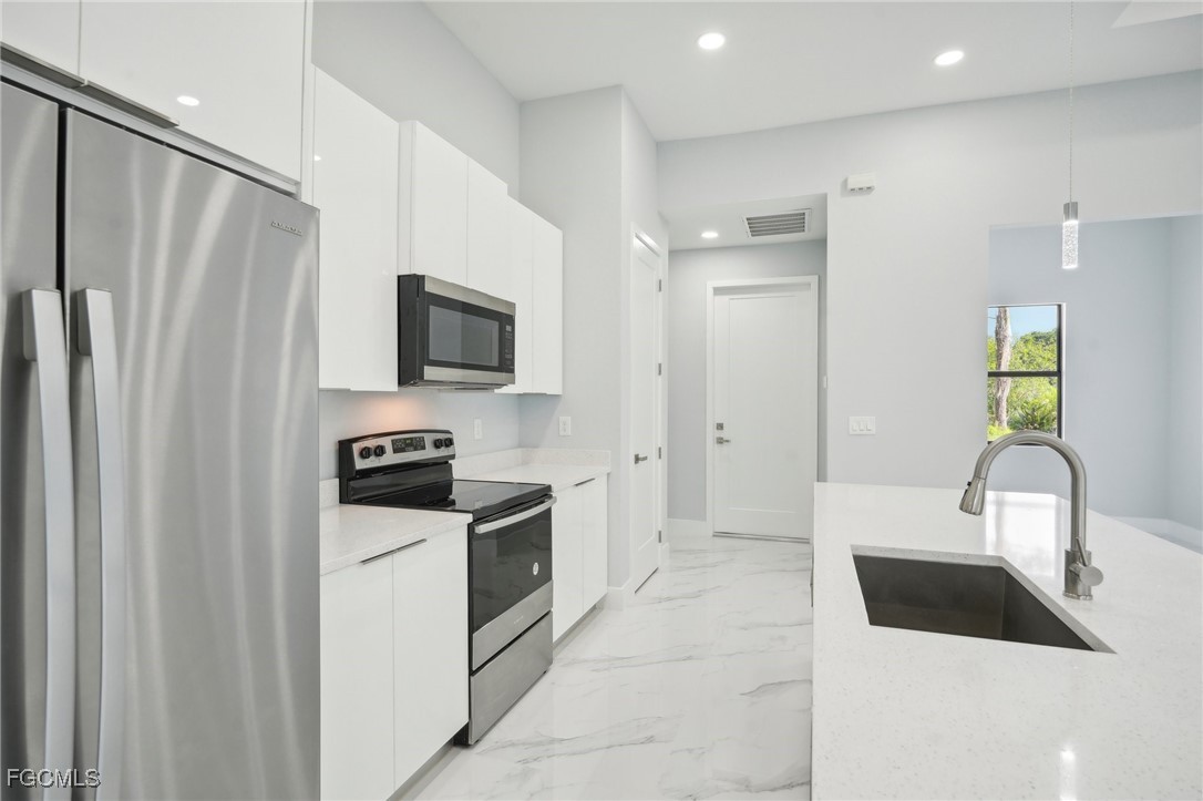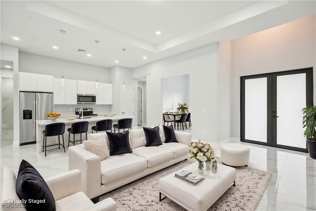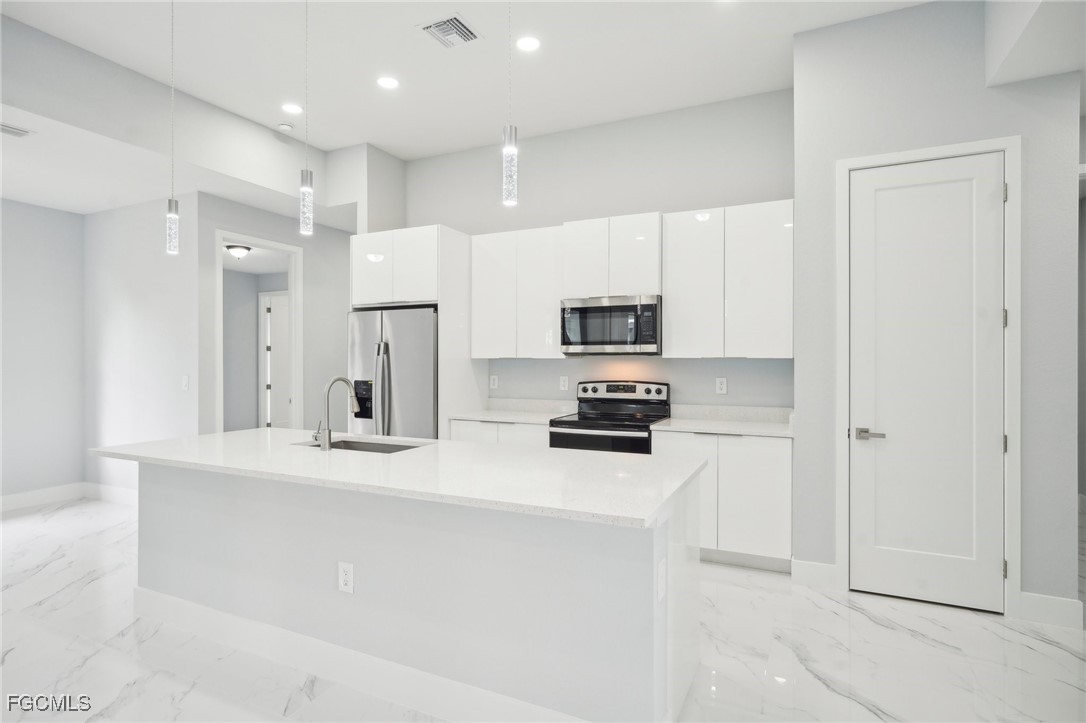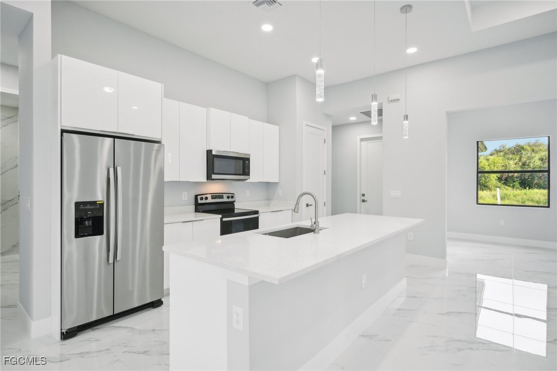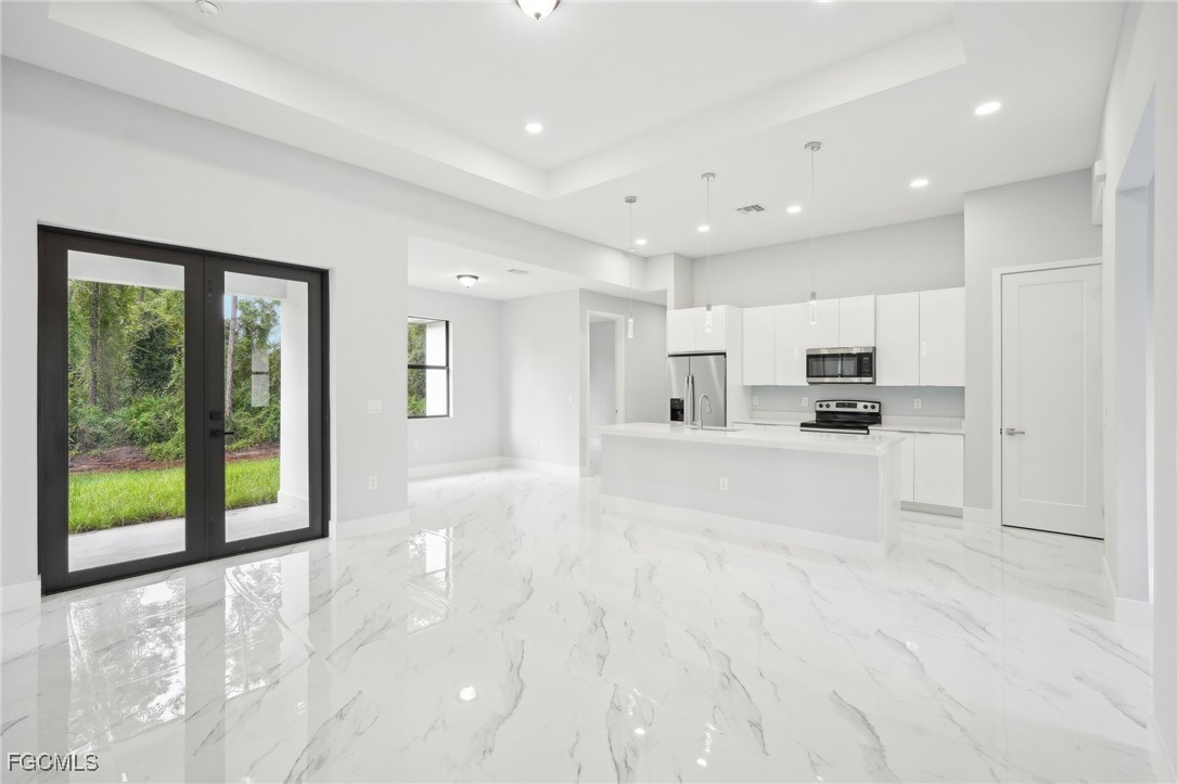 Welcome to YOUR brand new home with open floor plan that feels spacious from the moment you walk in thru the oversized French doors. Creating a perfect space for family and entertainment, the modern kitchen featuring a large waterfall island with stainless steel appliances, white cabinets and ample storage. This residence offers three bedrooms plus den, boasting three full baths and a two-car garage. Master suite features his/hers walk-in closets, dual sink, tub and shower. Prime location, minutes away from fine dining and shopping, also very close to the stunning beaches of Fort Myers.