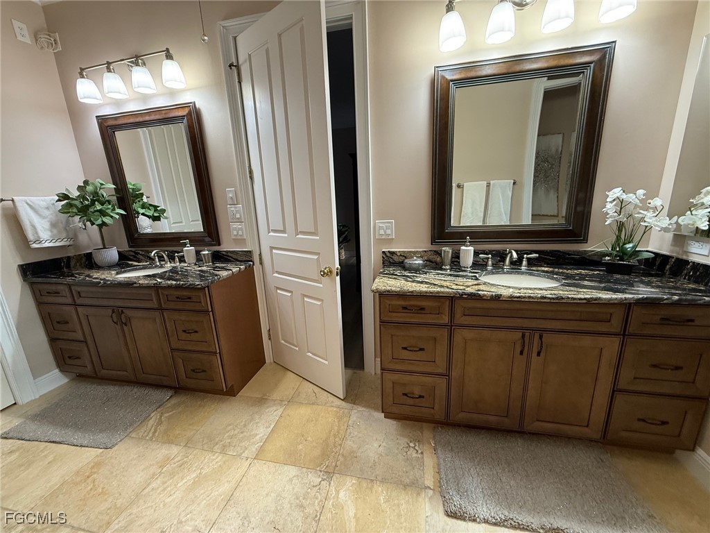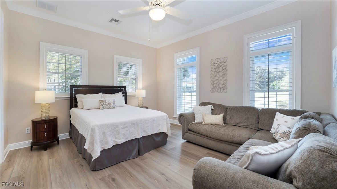 The primary suite is truly a sanctuary—boasting dual vanities, an oversized walk-in shower, a luxurious soaking tub, and two enormous closets with floor-to-ceiling storage. Step out onto your private screened lanai, the perfect spot for morning coffee or evening relaxation.