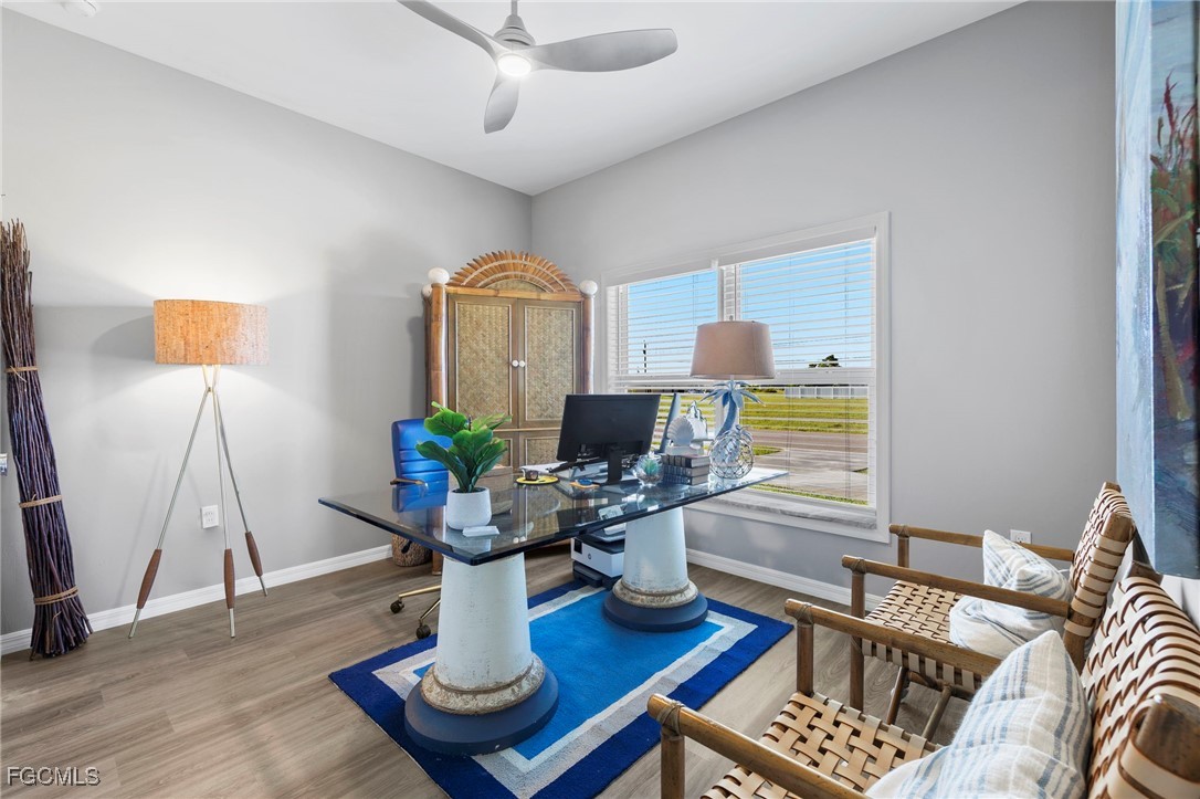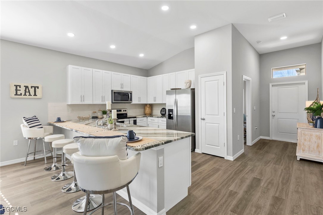 NEW contruction home , 3-CAR GARAGE home with a fenced backyard. This property boasts 4 bedrooms (Or 3 + study), 2 baths fully fenced backyard and is located in the heart of Cape Coral. This home features many impressive upgrades including laminate flooring throughout along with 42-inch wood cabinets with soft close hinges and drawers. Metal roofs are not only attractive but also extremely durable in storms. The beautiful granite countertops and tile backsplash bring together the kitchen atmosphere with a sense of style and class. The 10-foot breakfast bar countertop can easily accommodate 5 bar stools. Lots of working space along with upgraded stainless steel appliances complete this spacious kitchen. There are ceiling fans in all bedrooms with a screened-covered lanai. The home has an indoor laundry room WITH a washer and dryer included! Lawncare can be included in your rent with a minimal increase. Rest at ease renting our homes with our superior customer service experience. We believe in building a solid, quality home. We believe in providing an excellent, convenient location. We have several homes nearly completed with more under construction. Choose from several move-in dates and addresses. Photos are of model homes not actual homes and have been virtually staged.