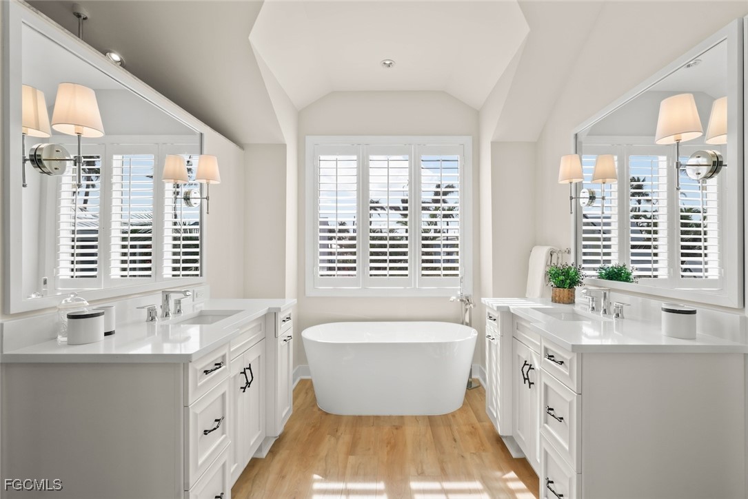 The bayfront primary suite is a private retreat, offering tranquil water views, dual walk-in closets, a private balcony, and a spa-inspired bath with soaking tub and walk-in shower.